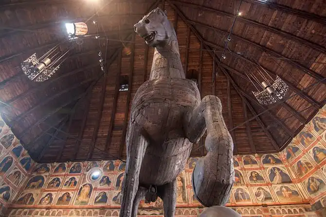 В торце зала стоит деревянный макет лошади Гатамелаты Донателло