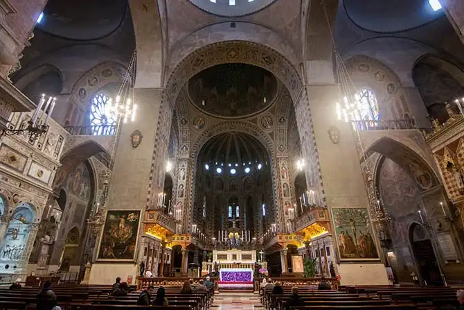 Настоящий шедевр кроется в баптистерии XII в., который сохранился от второго, романского храма. Внутри – ошеломляющие фрески Джусто де Менабуои. К сожалению, в полной мере оценить не удалось – внутри сейчас идет реставрация, но некоторые детали уже открыты. Так выглядит купол, а так – одна из стен.