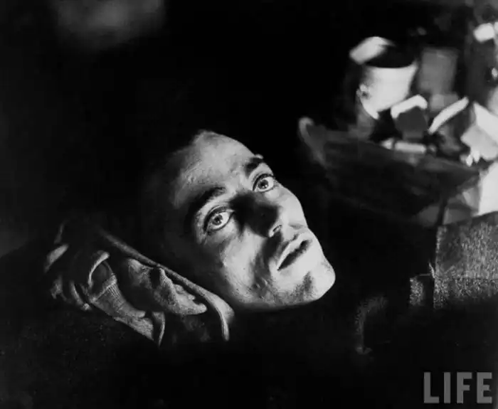 Крупным планом отрешённый взгляд измождённого американского военнопленного, лежащего на койке после освобождения из немецкого лагеря союзными войсками. Снято в Лимбурге, Германия, 1945 год.