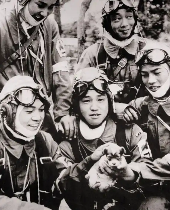 На фото 17-летний капрал Юкио Араки держит щенка, вокруг него четверо молодых парней в возрасте 18 лет, все они из 72-ого корпуса Синбу. Оператор Асахи Симбун сделал этот снимок за день до их боевого вылета с авиабазы для камикадзе Бансэй. Юкио Араки умер в 17 лет, участвуя в теракте на американских кораблях возле Окинавы 27 мая 1945 года. Почти всем пилотам-смертникам во время окинавской кампании было от 17 до 22 лет. Совсем не такими люди представляют себе фанатичных лётчиков-камикадзе.