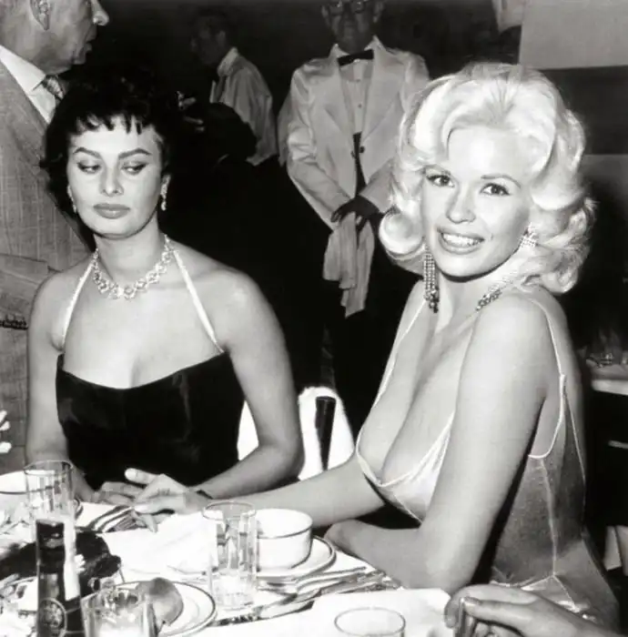 Софи Лорен и Джейн Мэнсфилд на вечеринке, устроенной компанией «Двадцатый век Фокс», в честь Софи Лорен в апреле 1957 года.
