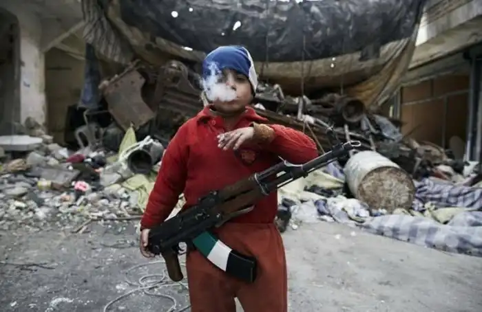 На фото восьмилетний Ахмед, сын сирийского мятежника, курит и стоит на страже с автоматом Калашникова образца 1947 года за баррикадой в Алеппо. Он один из самых юных бойцов, вовлечённых в гражданскую войну в своей стране.