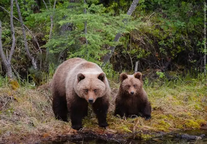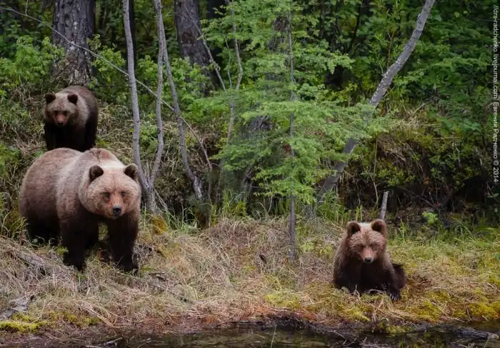 Бурая семейка долго колебалась, переглядывалась, переминаясь с лапы на лапу и все таки голод заставил хищника сделать первый шаг на встречу еде.