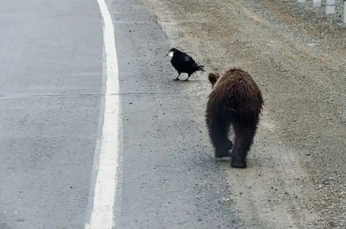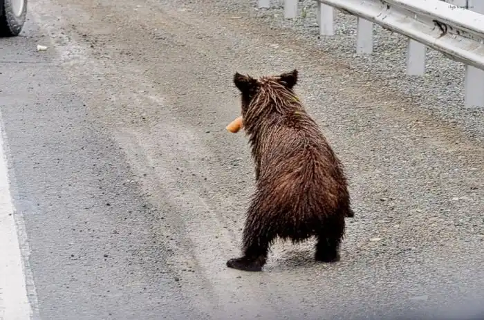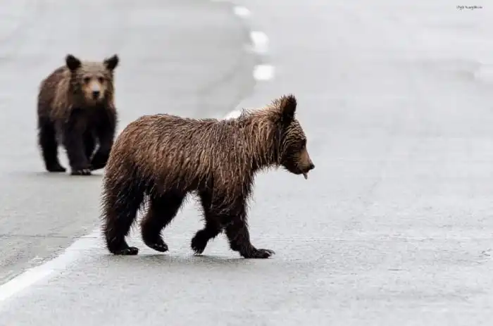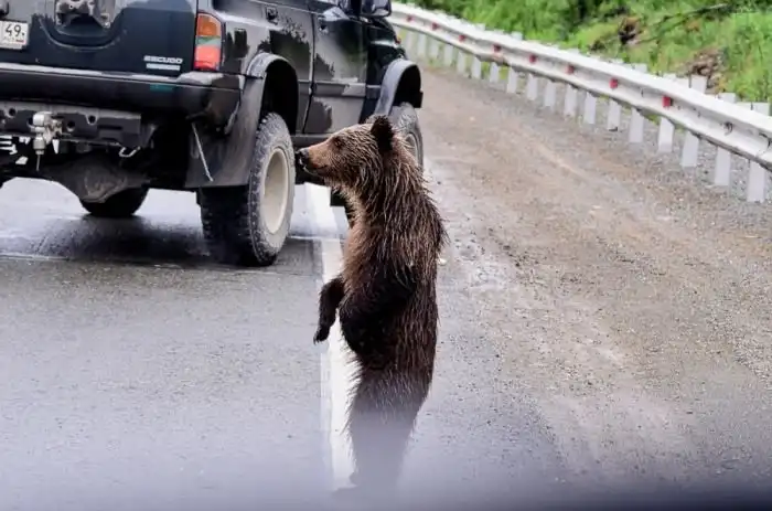Теперь пара сирот кормятся от проходящих машин утратив природные навыки добычи пропитания.