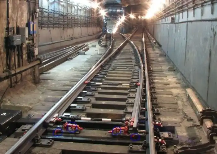 В метрополитене она встречается в таком виде. Здесь следует обратить внимание на тягу между двумя остряками, она выкрашена в черно-белую полоску.