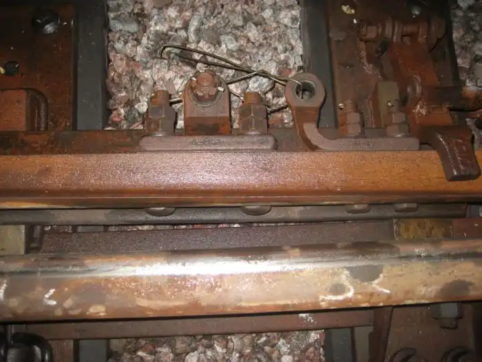 Первое, на что стоит обратить внимание – отсутствует тяга между остряками, а на ее месте – висит болт. На месте „контрольной тяги“ висит та самая проволочка. Тем не менее, на фото – левый остряк, который при прямом переключении стрелки должен быть \»отжат\" от рельсы, в каком положении он и находится на фото. Суд по длине петли, она была прикручена к ушку пластины фиксирующей накладки. Но это левый по ходу движения остряк и даже в таком виде он ни на что не влияет.