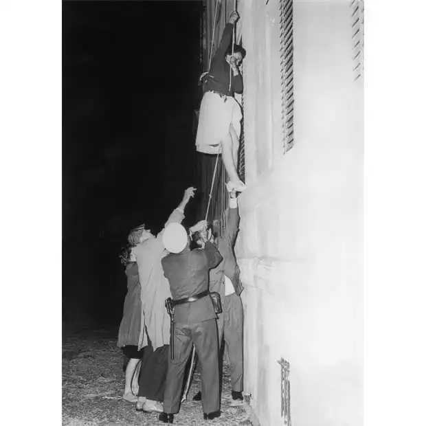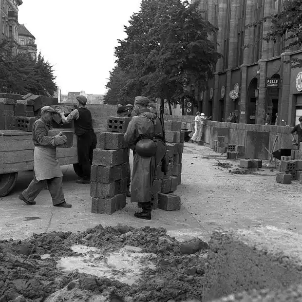 Берлинская стена - сооружение, почти на четыре десятилетия разделившее Германию на две страны - ГДР и ФРГ. Она была возведена в 1961 году, и в архивах осталась фотохроника строительства. Снесена стена была за несколько месяцев после внесения земель бывшей ГДР в состав ФРГ.