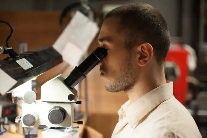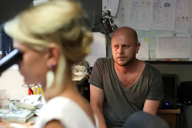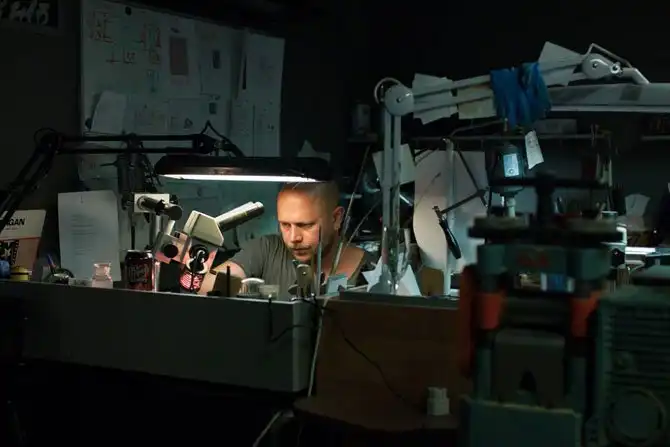 Владимир Маркин собирает серьги — при нажатии кнопки на них лепестки раскрываются и становится видна бриллиантовая капля росы.