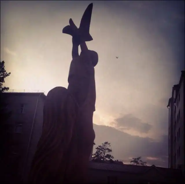 Умелые руки скульптора превратили сухое дерево в скульптуру в виде женщины, поднимающей на руках ребенка, который выпускает из рук голубя.