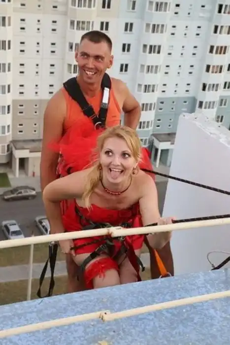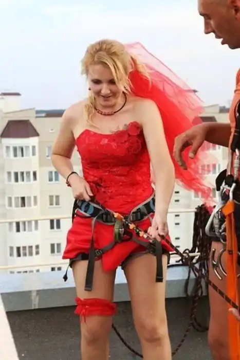Девушка с плакатом в руках, розой в зубах и в фате спустилась с крыши (при помощи инструктора) девятиэтажки на балкон собственной квартиры, где в это время находился ее любимый.