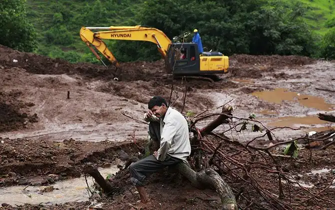 Мужчина, который (по его словам) потерял 13 членов своей семьи, сидит и плачет на месте, где был его дом, в селе Малин в штате Махараштра. Число погибших при сходе оползня в Индии превысило 70 человек.