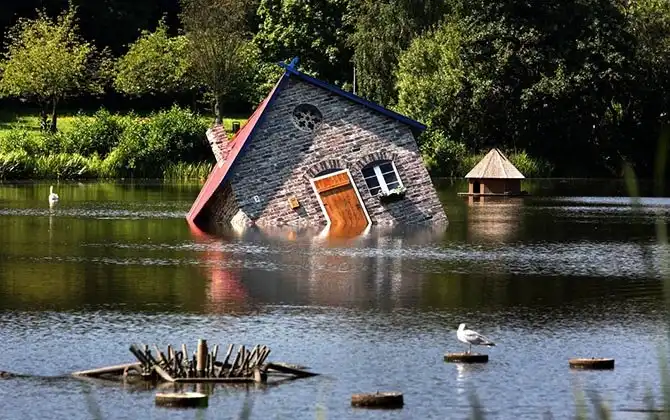 «Затонувший дом» в пруду музея в Ростоке, Германия.