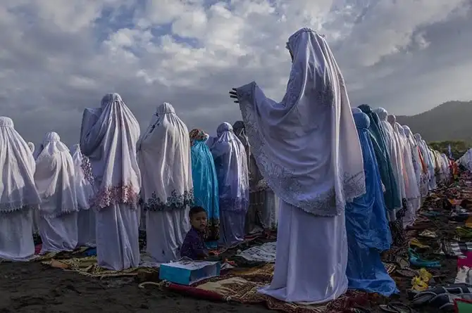 Индонезийские мусульмане молятся во время Ид аль-Фитра на пляже из черного песка Парангкусумо в Джокьякарте.