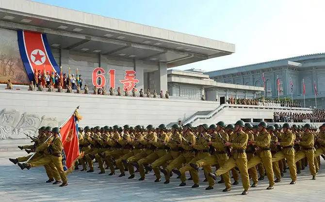 Военные маршируют на площади перед Кымсусанским дворцом Солнца во время мероприятий в честь 61-й годовщины окончания Корейской войны.