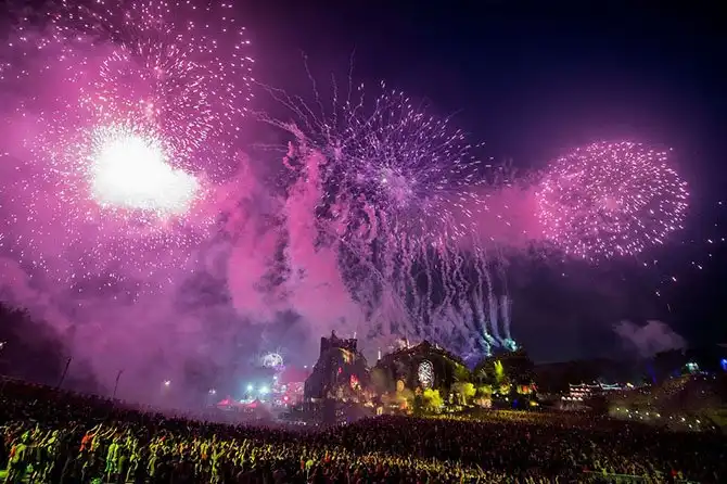 Фейерверки освещают небо на третий день музыкального фестиваля Tomorrowland в небольшом бельгийском городке Бум.