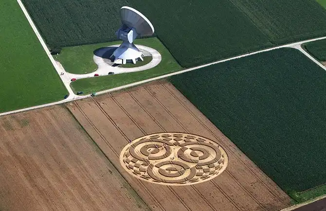 Люди ходят внутри круга на пшеничном поле на территории коммуны Райстинг, недалеко от Мюнхена. На юге Германии любители воздухоплавания обнаружили странный круг диаметром около 75 метров с необычным узором внутри. Владелец поля Кристоф Гютнер заявил, что не знает, кому принадлежит авторство.