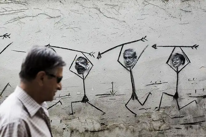 Иранец проходит мимо рисунков на стене на улице в столице Ирана Тегеране, на которых изображены с копьями президент США Барак Обама, премьер-министр Израиля Биньямин Нетаньяху и канцлер Германии Ангела Меркель. Духовный лидер Ирана аятолла Али Хаменеи призвал весь исламский мир вооружить палестинцев, чтобы они могли противостоять, назвав действия Израиля в секторе Газа геноцидом и исторической катастрофой.