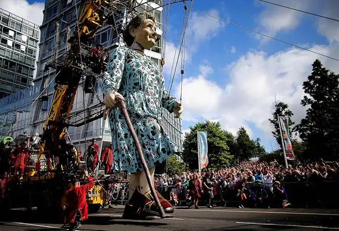Гигантская бабушка идет по улице Ливерпуля во время мероприятий, приуроченных к 100-летию с начала Первой мировой войны.