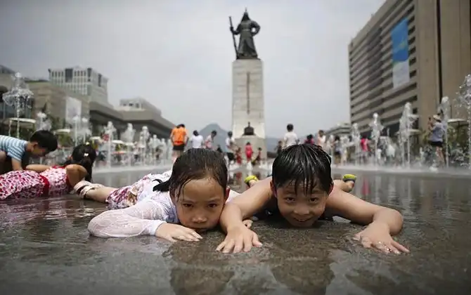 Дети в жаркий день играют возле фонтана на площади Кванхвамун в центре Сеула.