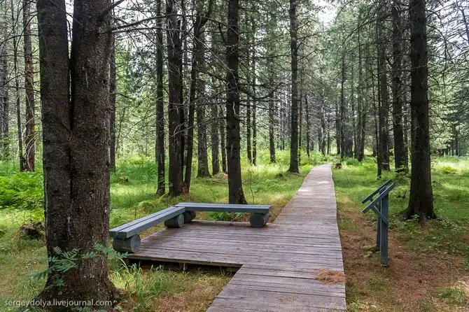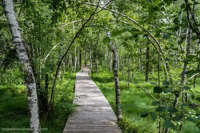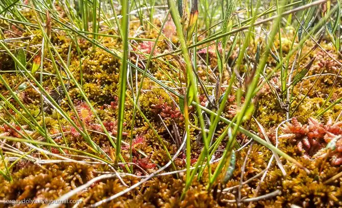 Экотропа закольцована и часть ее проходит через болото, где растет росянка английская. Это насекомоядное растение, которое поедает комаров и разную мошкару: