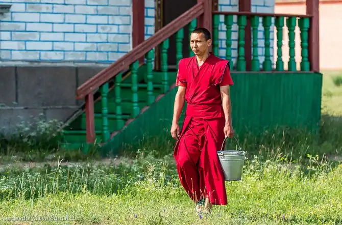 У каждого ламы есть несколько послушников. Так как у этого парня отсутствует желтый цвет в одеянии и присутствует ведро – нам подумалось, что он и есть один из них: