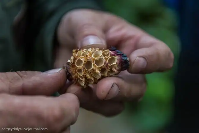 В заповеднике много бурундуков, которые пробуют шишки на зуб – созрели или еще нет? Их главный враг медведь. Он раскапывает бурундучьи норы и наглым образом поедает запасы кедровых: