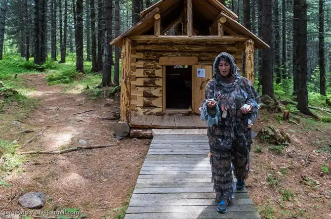 В конце экологической тропы стоит зимовье, как у настоящих охотников. Раньше охотники передвигались от зимовья к зимовью: переночевал и пошел дальше.