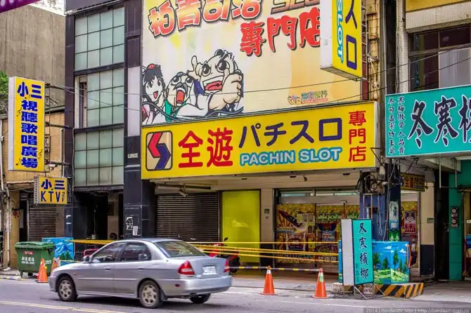 Набрели на улицу с игорными заведениями. На Тайване законодательство весьма странное: запрещены азартные игры с дилером, но автоматы — пожалуйста. Похоже, бизнес держат японцы — везде надписи на их иероглифах