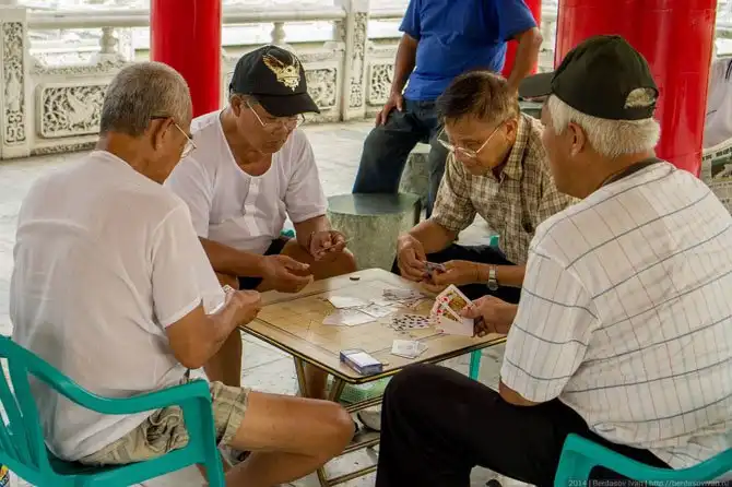В беседках китайские дедки играют в маджонг, китайские шашки и шахматы, а также в карты