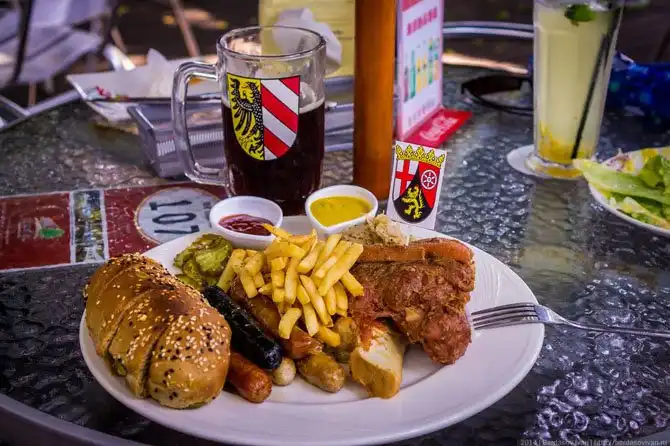 Вот такое блюдо (рулька, 5 видов сосисок плюс ганир), а также фруктовый салат, два кукурузных супа, два напитка и два мороженых всего за 1100 рублей. Почему в Москве одна рулька стоит от 1000?