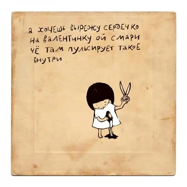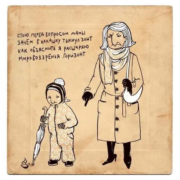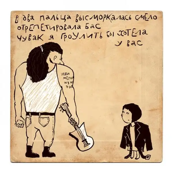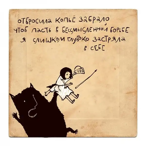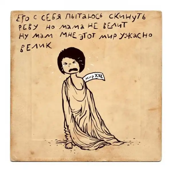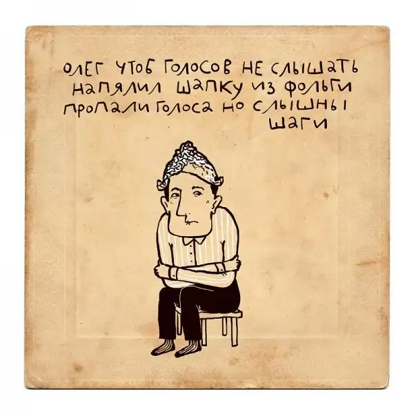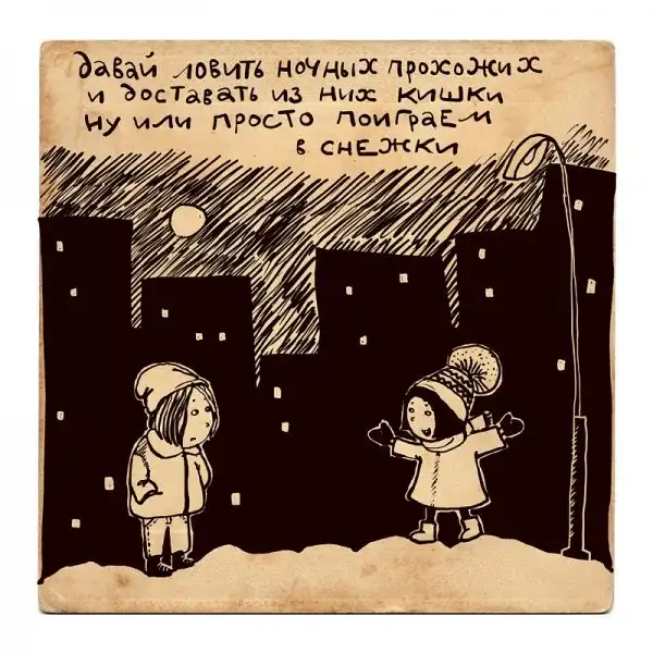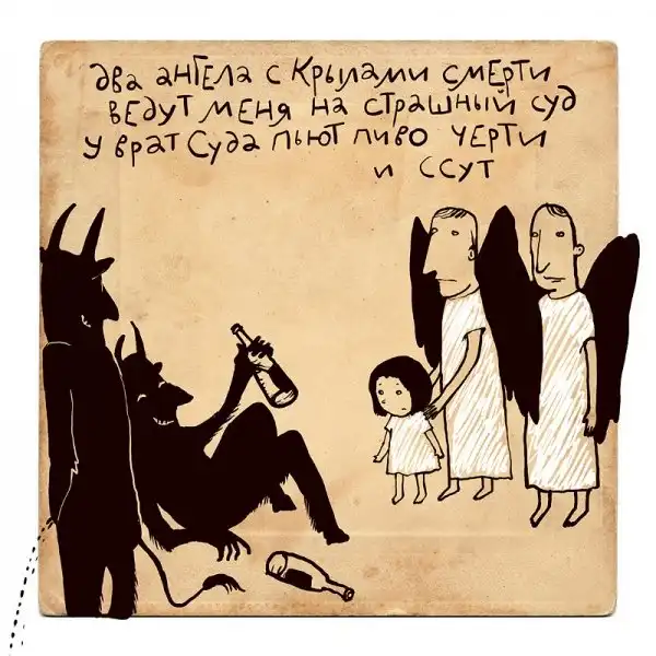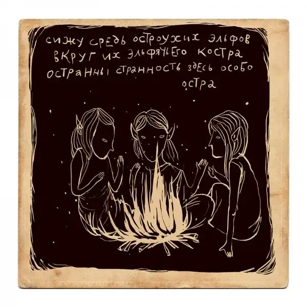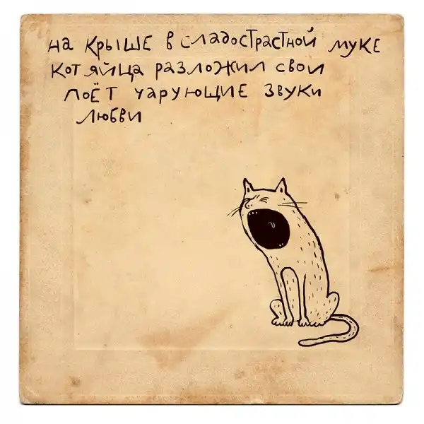 Ирина Сазонова, среди всего прочего, рисует очень примечательные картинки — в нарочито небрежном, примитивистском «лубочном» стиле. Каждый рисунок сопровождается рифмованным двустишием — иногда абсурдным, иногда жизненным, но всегда неожиданным, ироничным и метким. Таких маленьких шедевров у нее много, и это хорошо — их хочется рассматривать еще и еще.