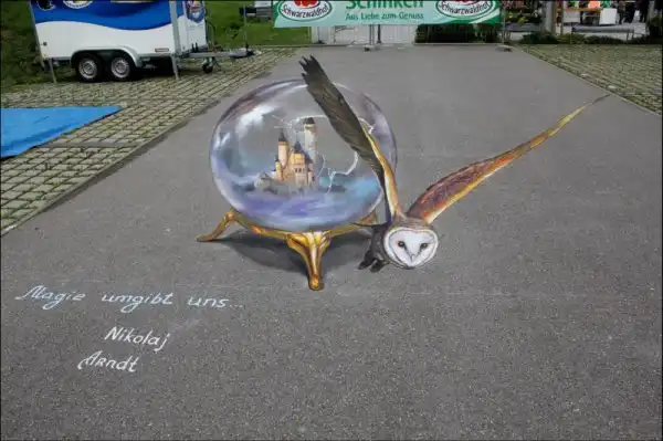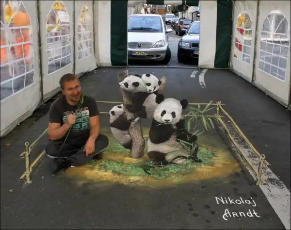 Российский художник Николай Арндт занимается стрит-артом в технике 3D с 2009 года. Принимает участие во многих фестивалях, где занимает призовые места. Вот некоторые из его работ.