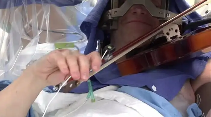 Во время операции, которая являлась глубокой стимуляцией мозга, пациент должен быть играть на скрипке и помимо всего прочего - отслеживать темп мелодии на электронном метрономе. К счастью, операция прошла успешно, и врачам удалось избавить пациента от недуга.