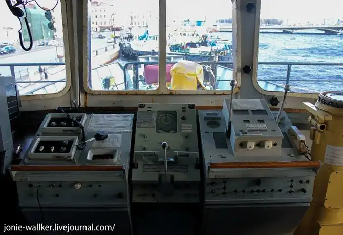 Для корабля 1986 года выпуска все в отличном состоянии. Главный пульт управления судном выглядит именно вот так. Никаких больших и деревянных штурвалов давно нет. Справа две ручки – это управление главными двигателями. От себя – вперед, на себя – назад.