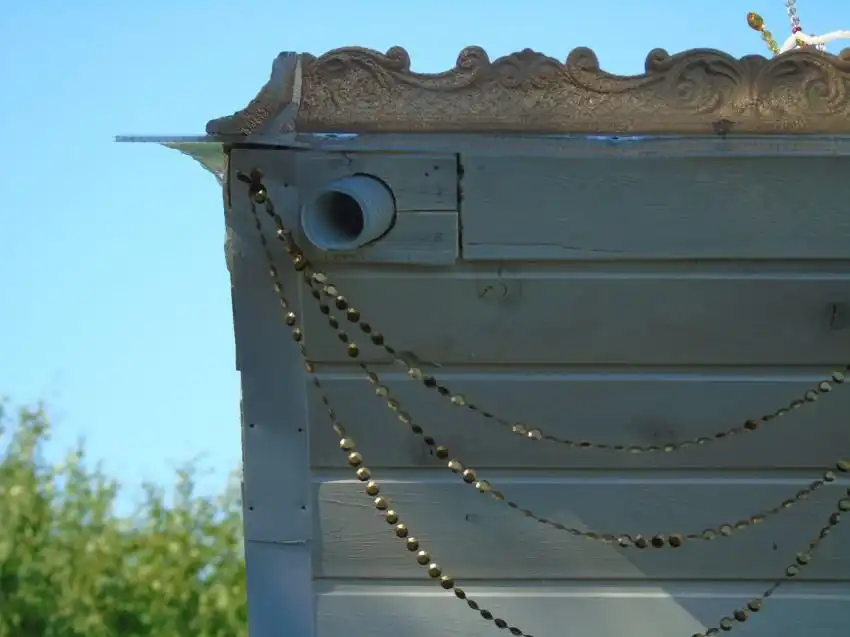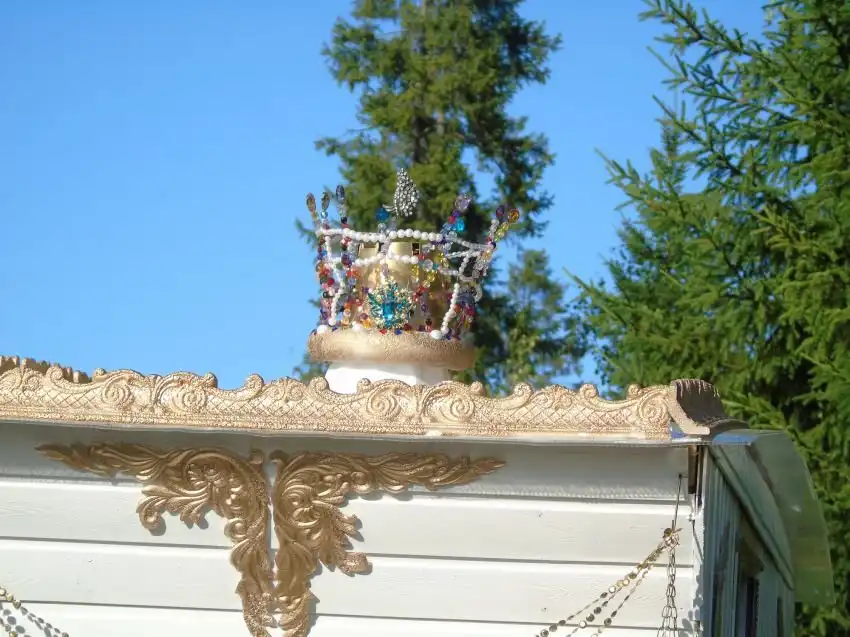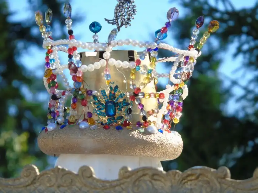 И что за карета без короны. Крышу украшает корона ручной работы. Для изготовления основы короны был вырезан пенопластовый круг и на него прикреплен цветочный горшок. Все это покрашено золотой краской, а далее из медной проволоки сделано обрамление и заполнено бусами из бижутерии.