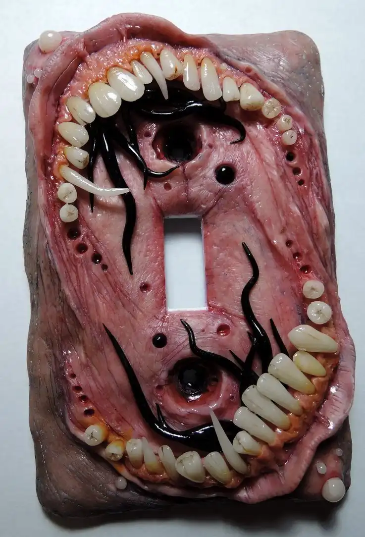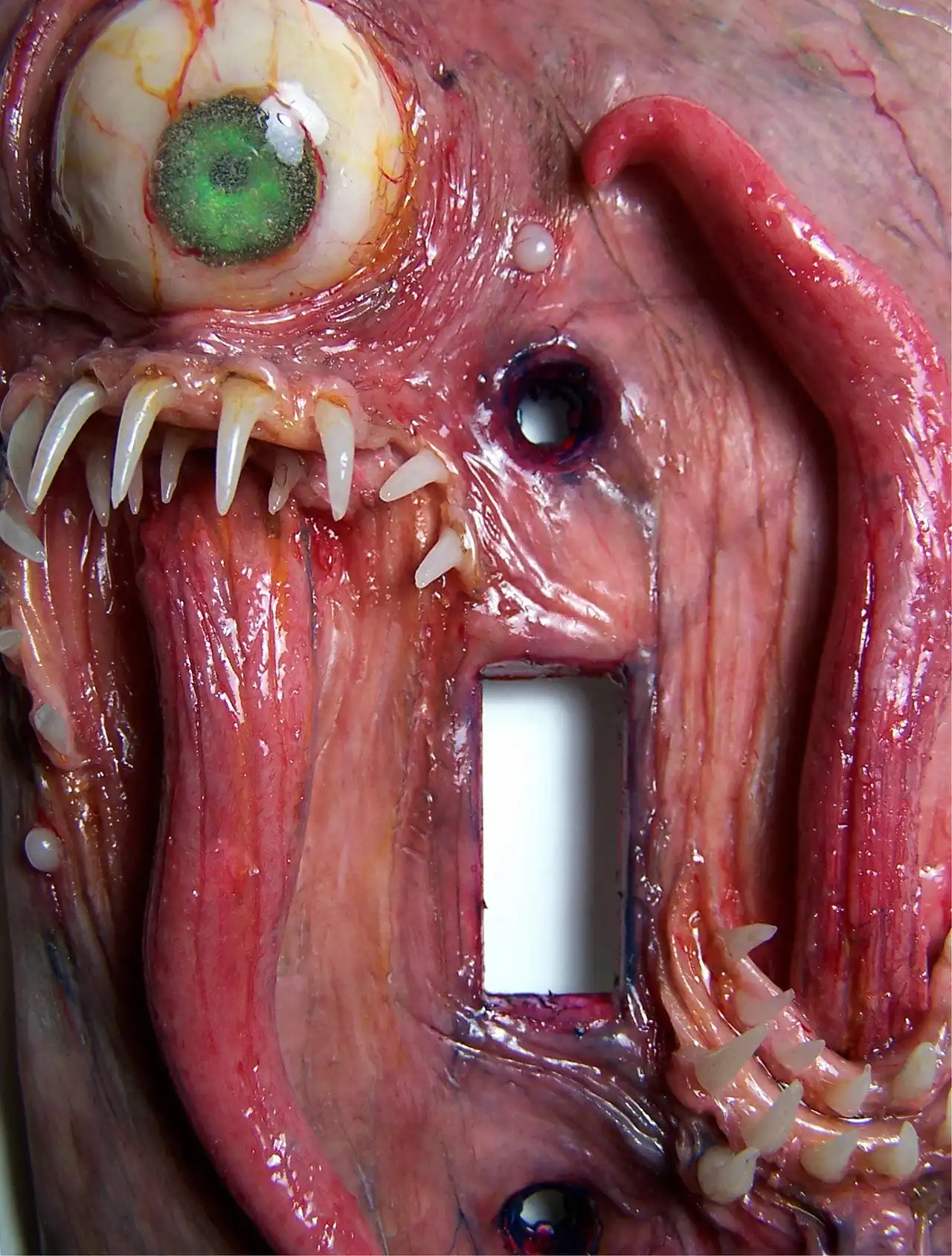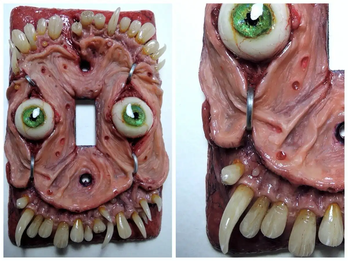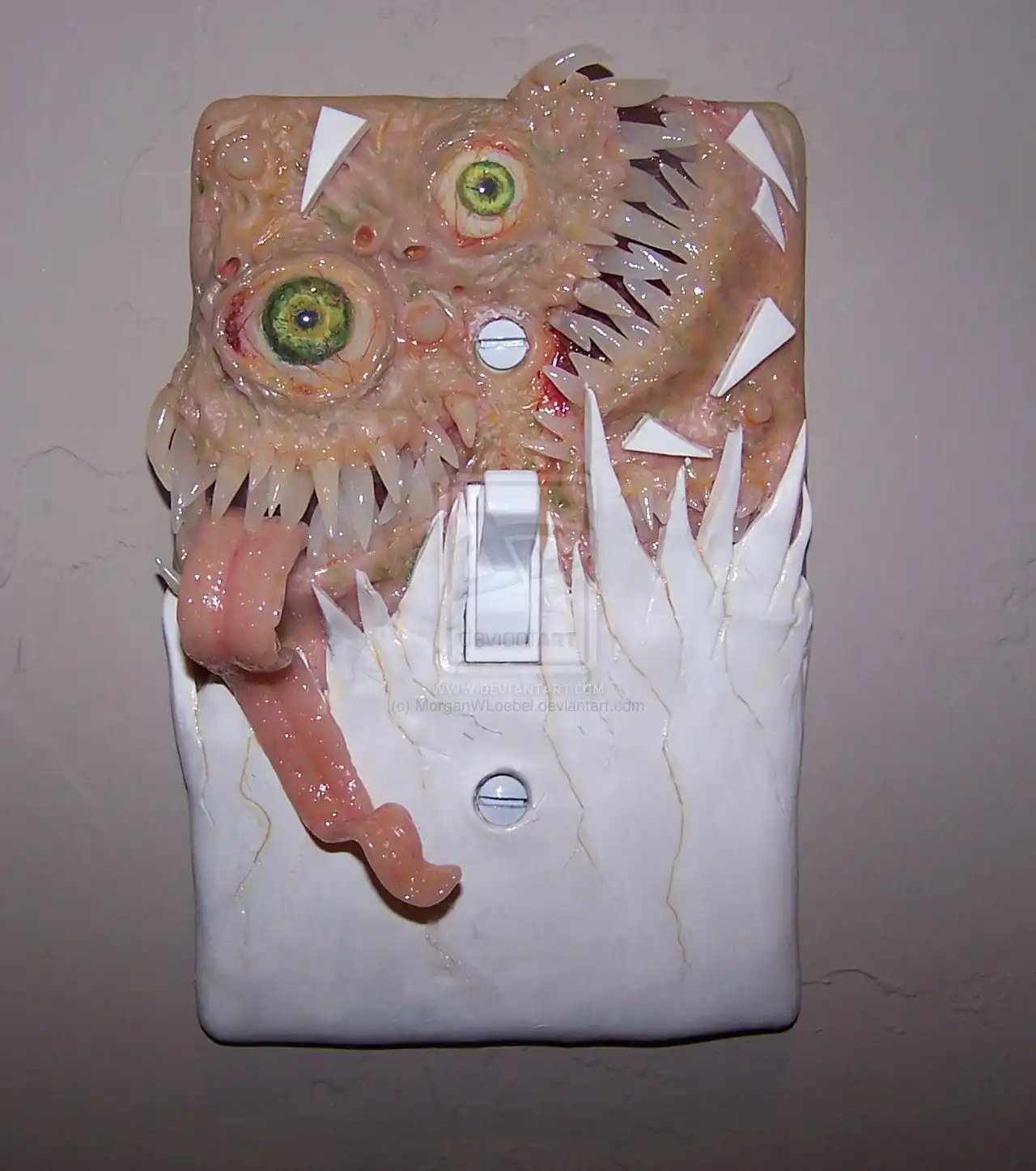 Аксессуары и различные «украшательства» для дома в виде выключателей, фигурок, ручек книг и розеток понравятся всем любителям ужастиков и фильмов о пришельцах. Занимательные фигурки от американского художника Morgan Loebel (который предпочитает называть себя Morgans Mutations) ужасают. Использование невероятного количества реалистичных зубов и глазных яблок только усиливает впечатление.