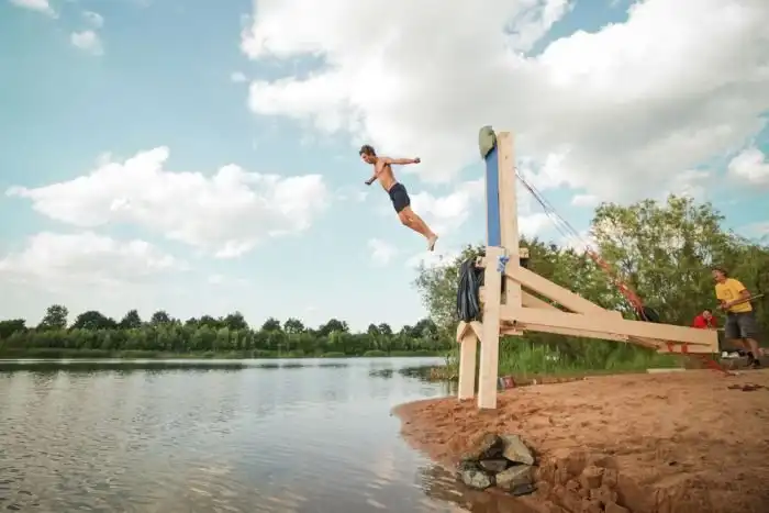 Два брата из Франкфурта, Германия, построили своими руками очень необычную человеческую катапульту на местном озере, которая стала незабываемым развлечением для всех их знакомых и друзей. На материалы для сборки катапульты они потратили чуть более тысячи долларов, что, конечно же, немало, но - удовольствие от полета на 5 метров в высоту и 12 метров в длину - точно того стоит.