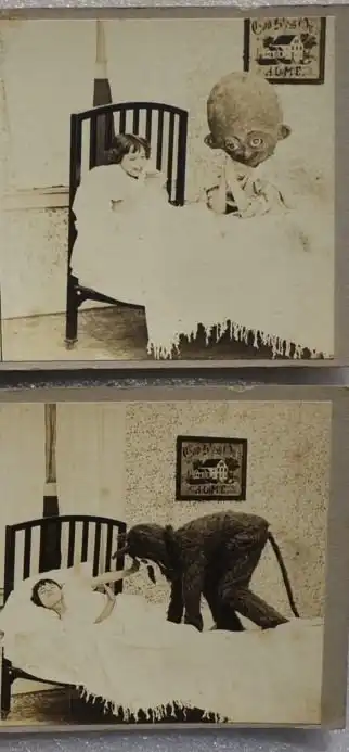 Эти веселые фотокарточки можно было смотреть на специальном стерео-приспособлении, чтобы получить эффект 3D, так сказать. Датированы 20-ми годами прошлого века, сделаны в США. Название серии "Гоблины тебя схватят, если ты не будешь осторожен". Какой воспитательный момент был предусмотрен, ума не приложу.