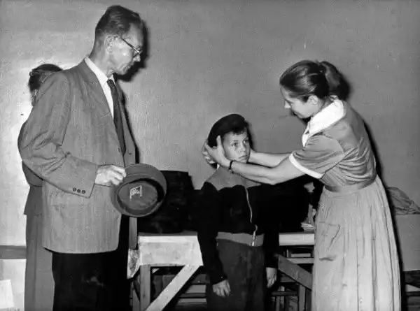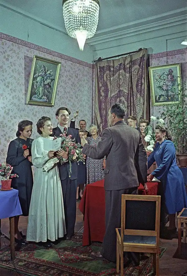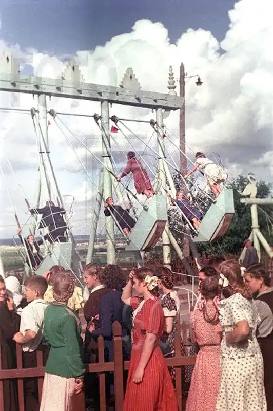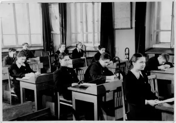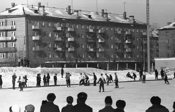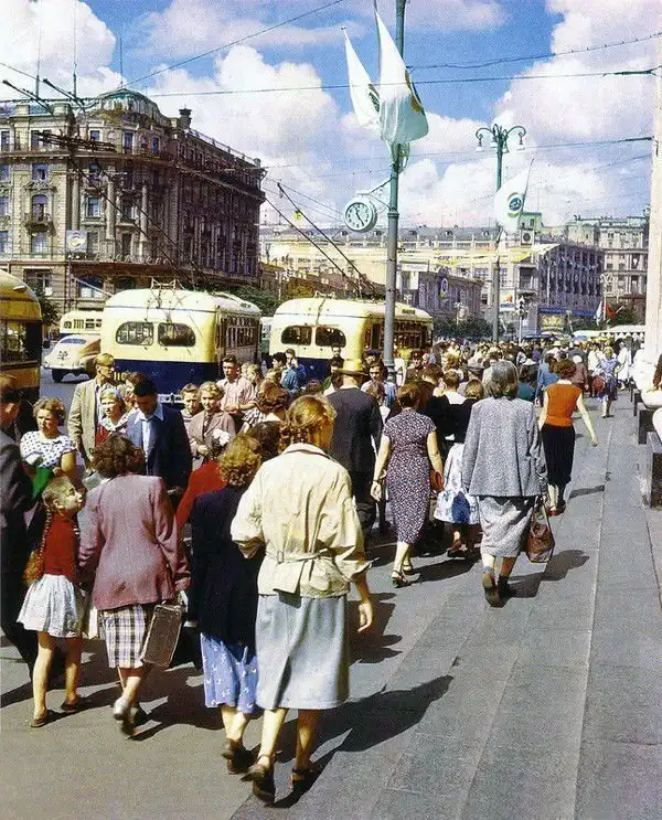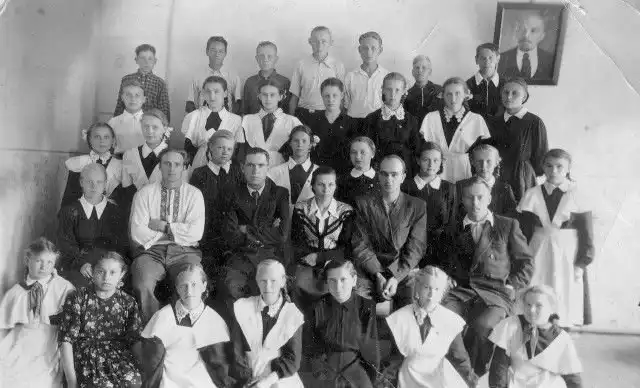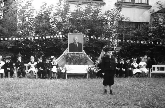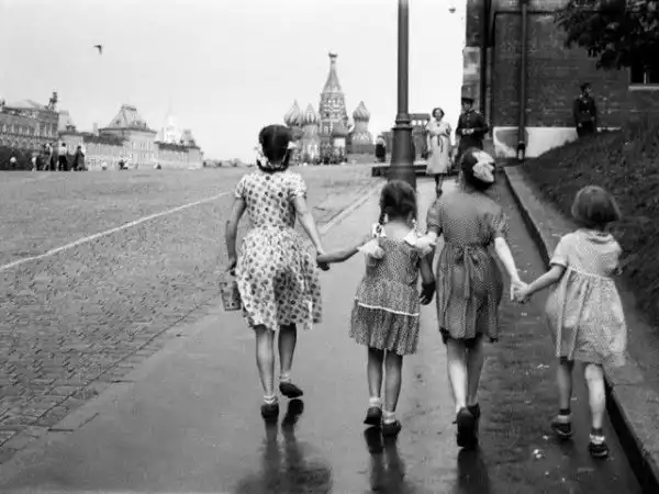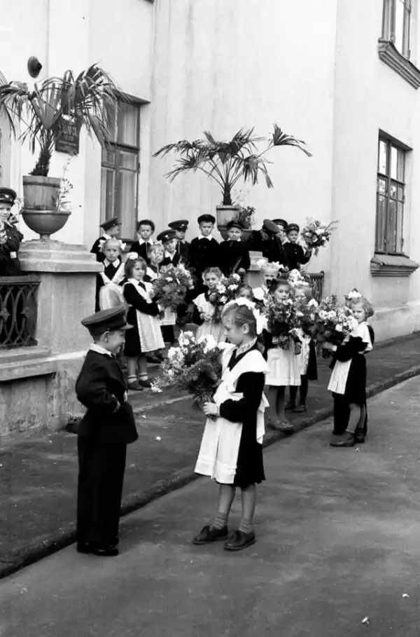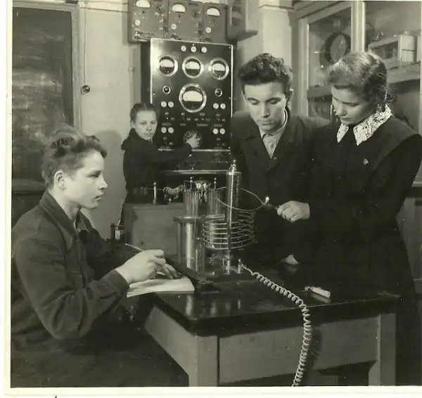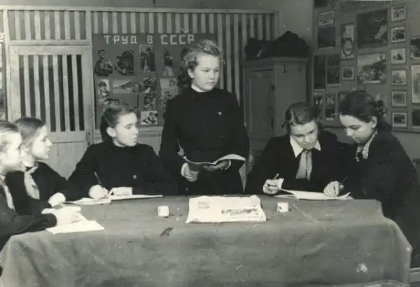 Ученики школы рабочей молодежи на фоне строящегося МГУ