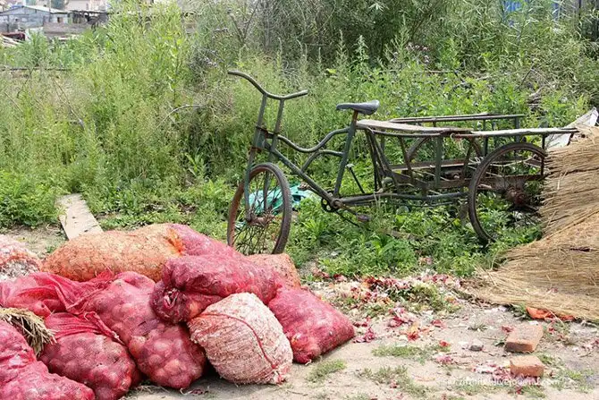Из моторизованного транспорта здесь только такие трехколесные мотоциклы. Возможно, этот приехал с рынка.
