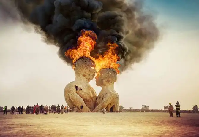К проекту «Объятия» его создатели готовились почти 12 месяцев. И, как от множества других произведений искусства на фестивале «Burning Man», от скульптуры остались лишь пыль и зола. «Объятия» говорят о том, почему смерть — это так сложно и красиво одновременно«, — рассказал ведущий художник Мэтт Шульц.