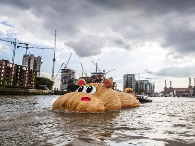 Голландский художник поместил огромную скульптуру бегемота (более 20 метров) в реку Темза. Большие глаза и забавные розовые уши сделали его любимцем местных жителей. По словам художника, на создание этой фигуры его вдохновило то, что когда-то бегемоты водились в этой реке. Он решил «возродить» историю и украсить окружающий серый пейзаж.