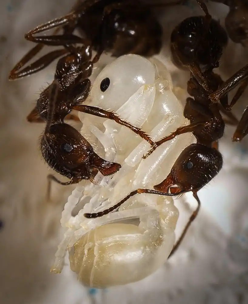 Однако, если приглядеться, можно увидеть, что муравьи снимают с куколки пленку!