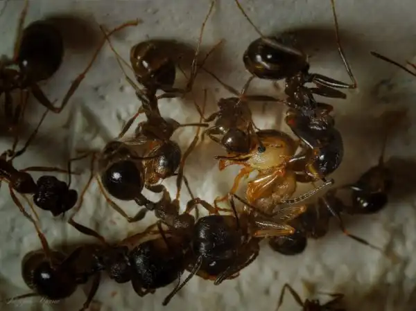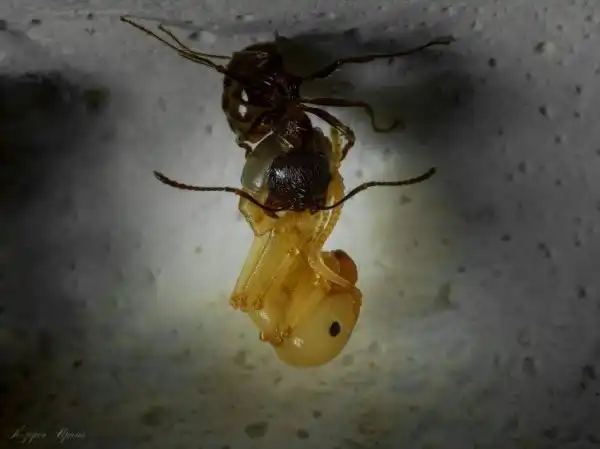Сами роды происходят довольно быстро - 30, максимум 40 минут. Вокруг куколки, вдруг, собирается много муравьев. Очень сложно увидеть, что именно происходит. Кажется, что они просто сосредоточенно ощупывают ее усиками и все.