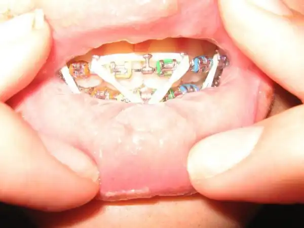 Улыбка девушки до операции. Её челюсть так сильно выступала вперёд, что даже когда её рот был закрыт, между верхними и нижними зубамы всё равно оставался зазор