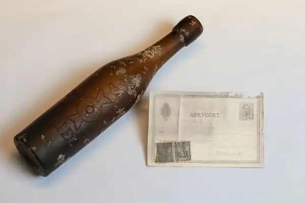 На фото ниже: 100-летнее послание в бутылке, найденное в Балтийском озере. Внутри бутылки была найдена открытка, отправленная в 1913 году внучке отправителя. К сожалению, сообщение не удалось расшифровать, но по всей видимость отправителем был немец, так как на открытке была найдена немецкая марка