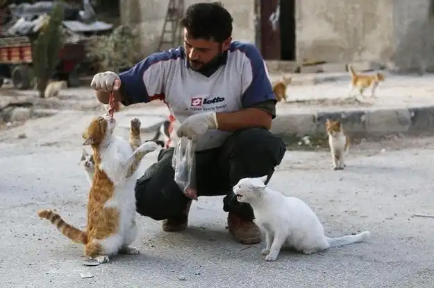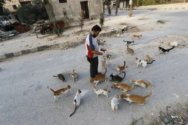 Большинство людей покинули город Масакен Ханано, расположенный неподалеку от Алеппо, из-за регулярных бомбардировок и постоянной стрельбы. Однако один мужчина возвращается сюда ежедневно, ведь его ждут более полутора сотен бездомных голодных котов
