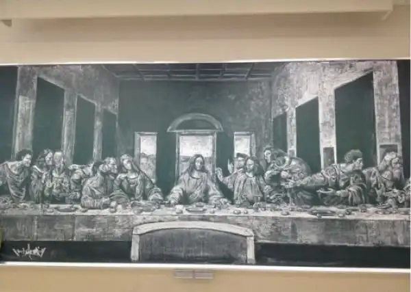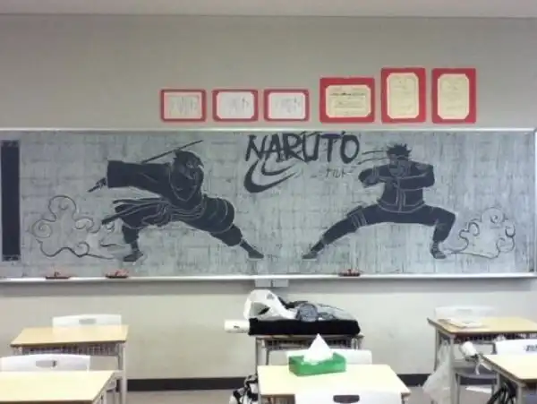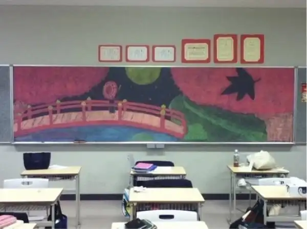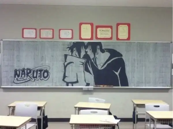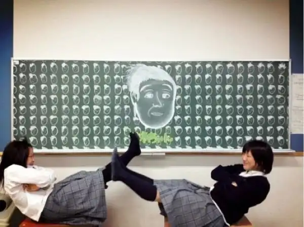 На моей памяти ни один мой одноклассник ничего толкового на доске ни разу не нарисовал. Все больше какую-то непотребщину. То ли дело японские школьники: вот они мелом выводят настоящие шедевры изобразительного искусства. Но и их учителя наказывают, наверное. За перевод мела.