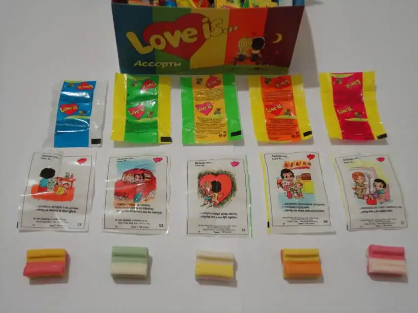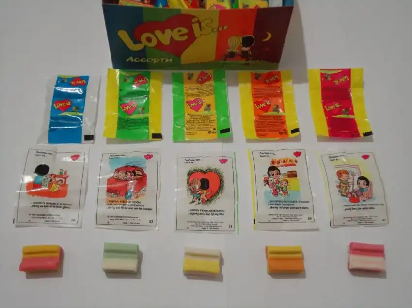 Рад, если Вас кинуло в то время и настигла ностальгия со всеми приятными моментами, которые Вы пережили! Простите, если заставил пустить слюну, возможно и у Вас в каком-нибудь магазине, супер или гипермаркете, продаётся эта ностальгирующая жвачка, мягкая, сладкая, с приятными вкусами детства и с известным названием - LOVE IS! Ещё бы, для полного счастья, найти бы другие жвачки детства такие как: Turbo, Donald, TipiTip, Bazooka, LAZER, BomBibom и многие другие...