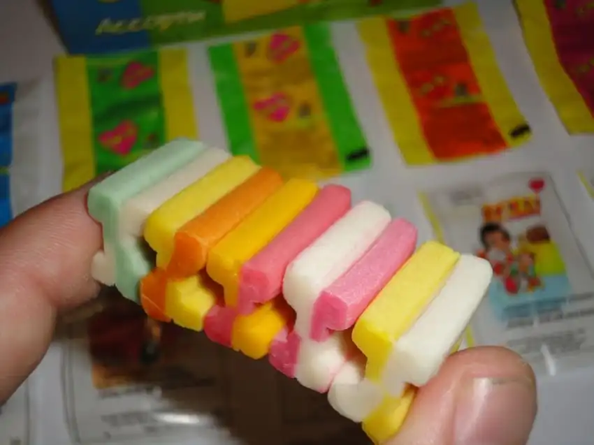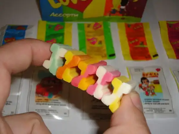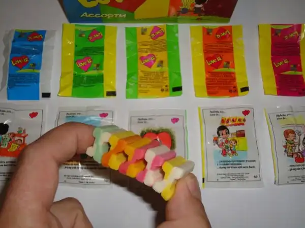 Обёртки, вкладыши и сами жвачки. Соответственно, отличаются разным двухкомпонентным цветом.